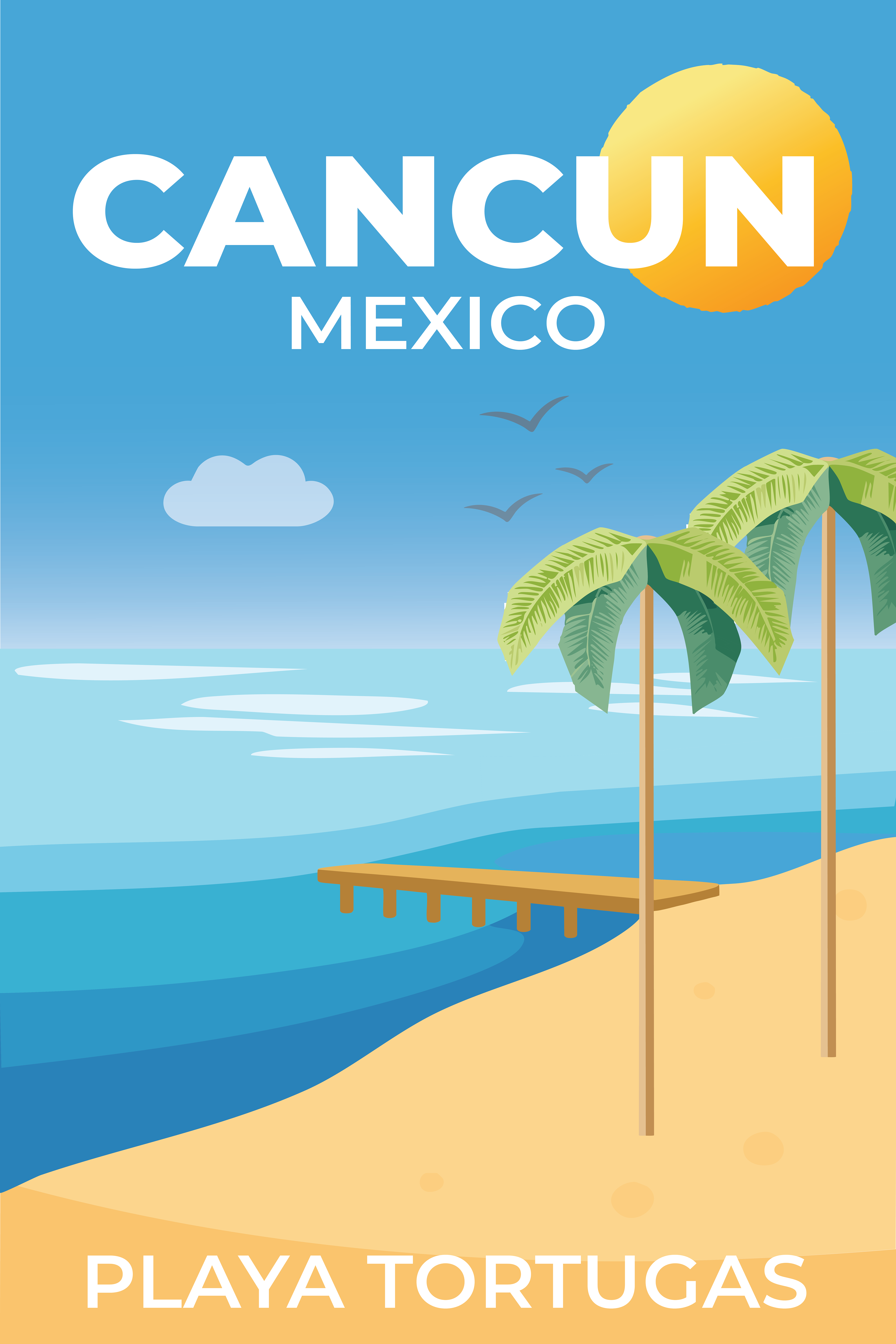 This travel poster series highlights three of Cancún’s beaches—Playa Delfines, Playa Tortugas, and Playa Norte—using bright colors, minimalist illustrations, and cohesive typography to capture each location’s atmosphere and tropical beauty.